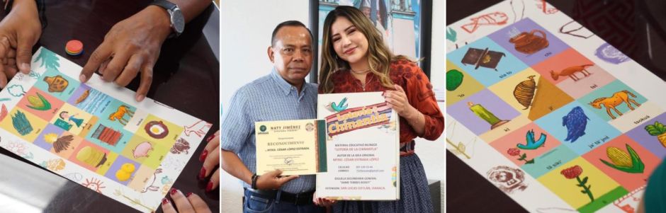 Durante la reunión, destacó el proyecto del maestro, quien a través del juego tradicional de la lotería busca implementar un método de aprendizaje que combina lenguaje visual y verbal, con el objetivo de brindar a la niñez más recursos didácticos para fortalecer su identidad lingüística.